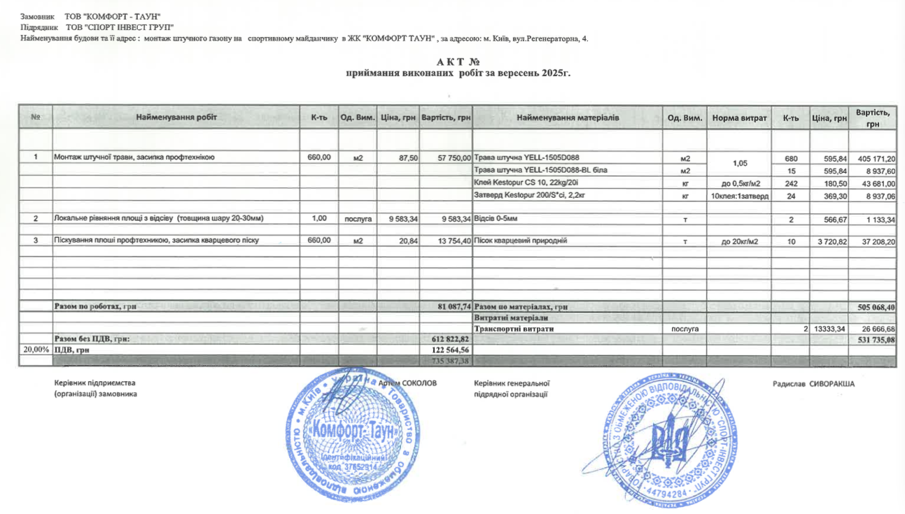 ✅ відновлено тенісний корт на вул. Регенераторній (735 387 грн) Акт виконаних робіт